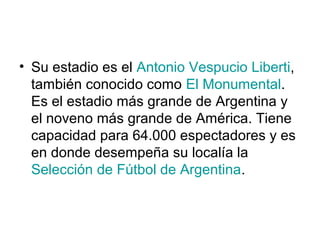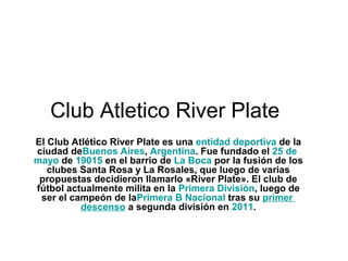 El Club Atlético River Plate fue fundado en Buenos Aires, Argentina en 1915. Juega en la Primera División luego de ser campeón de la Primera B Nacional tras su primer descenso en 2011. Su estadio es el Estadio Antonio Vespucio Liberti, también conocido como El Monumental, el estadio más grande de Argentina. River Plate es uno de los cinco grandes clubes de fútbol en Argentina y el más exitoso con 53 títulos oficiales.
