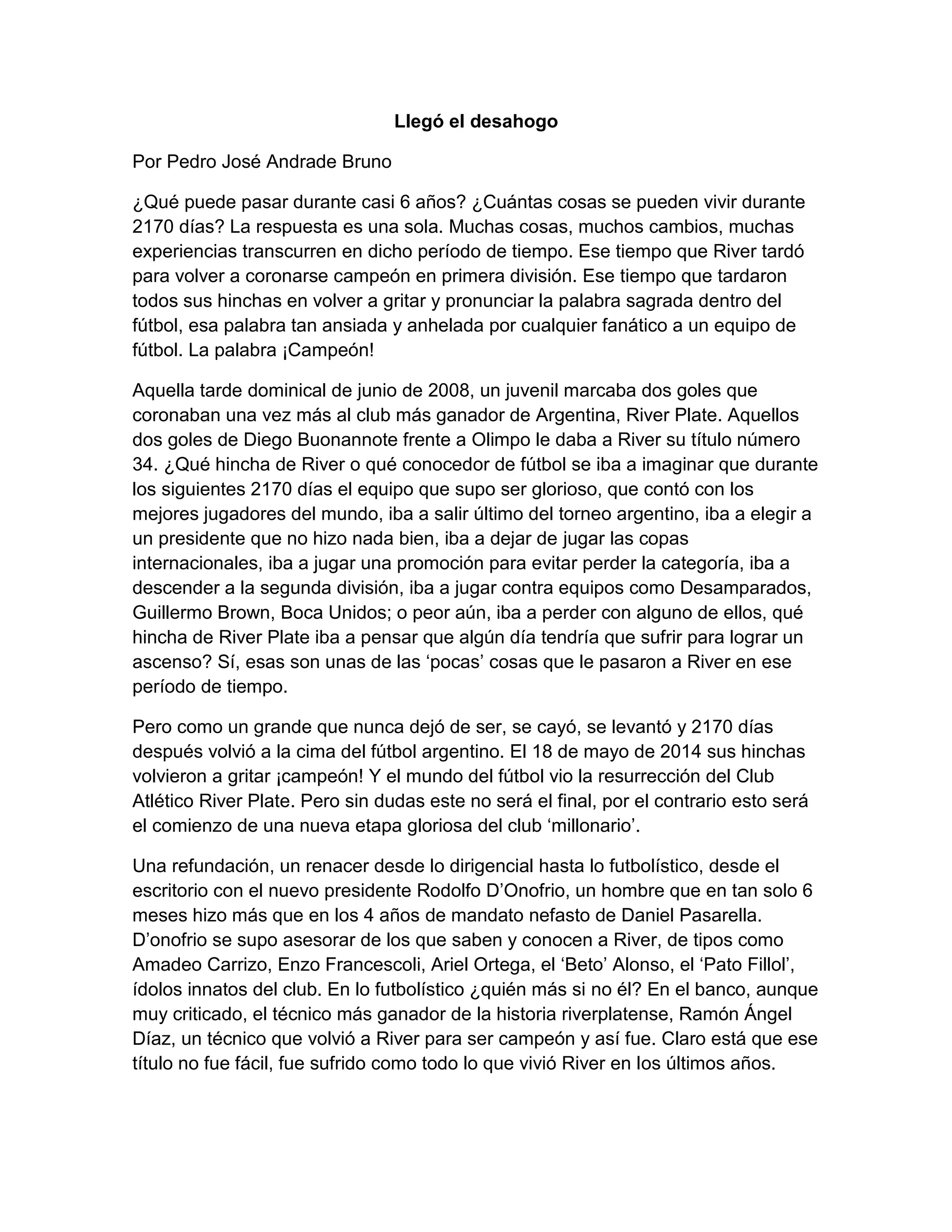 El documento describe la alegría de los hinchas de River Plate luego de que el equipo ganara su primer campeonato en 6 años. Explica que River pasó por momentos difíciles durante ese período, incluido el descenso a la segunda división, y cómo finalmente se reconstruyó bajo nueva dirección y ganó el campeonato con Ramón Díaz como entrenador y el regreso de Fernando Cavenaghi. El título trajo alivio y celebración a los fanáticos que sufrieron durante los largos años de sequía sin trofeos