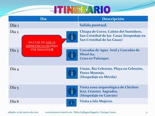 El documento presenta un itinerario de 12 días que incluye visitas a sitios turísticos en Chiapas, Campeche, Yucatán y Quintana Roo. El viaje comienza en Chiapa de Corzo y finaliza en Villahermosa, incluyendo paradas en San Cristóbal de las Casas, Palenque, Mérida, Chichen Itzá, Cancún, Isla Mujeres, Playa del Carmen y Tulum. El costo total del paquete es de $4,300 por persona.