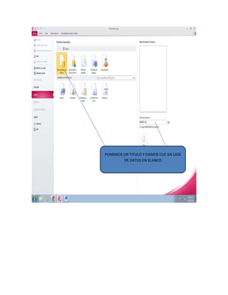 El documento describe los pasos iniciales para crear una base de datos en Access 2010, incluyendo poner un título, seleccionar la vista de diseño, y crear una tabla para almacenar información sobre una empresa. Explica que después de crear la primera tabla, se pueden crear más tablas y ajustar el diseño y vista de página de cada una.