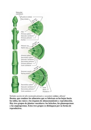 Los rizoides son estructuras similares a raíces que cumplen la función de fijar organismos acuáticos como algas, cnidarios y esponjas al sustrato. Su forma y ramificaciones varían dependiendo del tipo de sustrato en el que viven. El xilema es un tejido leñoso de las plantas vasculares que transporta agua y minerales desde la raíz hacia las hojas a través de células muertas. Los esporófitos son la generación diploide de plantas y algas que producen esporas haplo