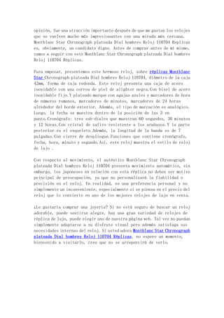 Este documento proporciona una revisión de una réplica del reloj Montblanc Star Chronograph plateada Dial hombres Reloj 110704. Describe las características del reloj, incluido su tamaño de 42 mm, caja de acero inoxidable y correa de piel de aligátor negro. Aunque la réplica usa un movimiento japonés en lugar de uno automático, se considera fiable y precisa. El documento recomienda este reloj de réplica de lujo a aquellos que buscan un reloj ele