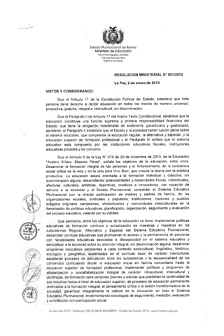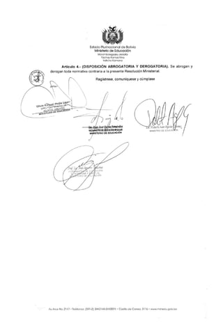 Este documento establece las normas generales para la gestión educativa en 2013 en Bolivia. Incluye el calendario escolar de 10 meses con 200 días hábiles, el periodo de inscripciones de enero a febrero, y los requisitos para la inscripción de nuevos estudiantes como certificado de nacimiento, carnet de vacunas, y documentos de identidad de los padres y estudiantes. También especifica horarios, descansos pedagógicos, y responsabilidades de registro de inscripciones.