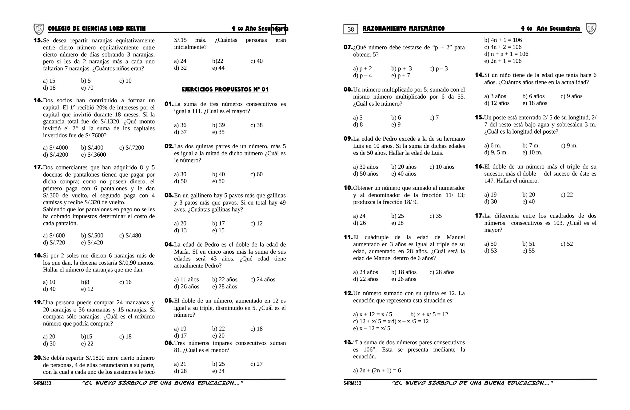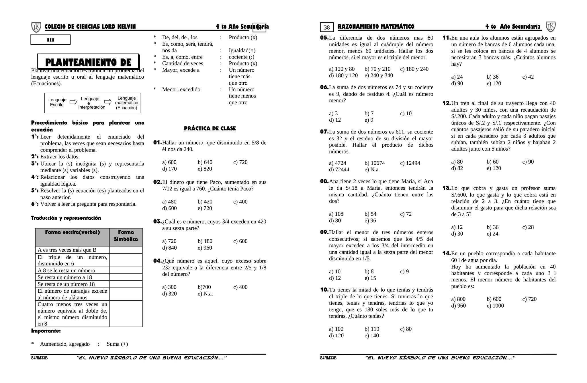 Este documento presenta los pasos para plantear ecuaciones matemáticas a partir de problemas verbales o escritos. Explica que traducir un problema al lenguaje matemático requiere 1) leer el enunciado para comprenderlo, 2) extraer los datos, 3) identificar las incógnitas y representarlas con variables, 4) relacionar los datos lógicamente para construir una igualdad, y 5) resolver la ecuación planteada. También provee ejemplos de traducciones entre lenguaje escrito y simbólico.