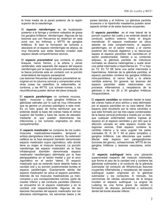 El documento describe los diferentes espacios anatómicos de la porción superior del cuello, incluyendo el espacio mucoso faríngeo, retrofaríngeo, prevertebral, parafaríngeo, masticador, parotídeo, carotídeo, sublingual y submandibular. Explica las estructuras contenidas en cada espacio y las lesiones más frecuentes que pueden afectarlos, como carcinomas, abscesos, linfomas y tumores. El documento provee una guía para la interpretación de imágenes de resonancia magnética del c