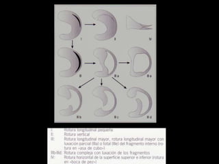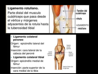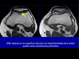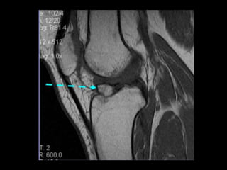 El documento describe la anatomía de la rodilla, incluyendo sus estructuras óseas, ligamentosas, meniscales y vasculares. Explica los procedimientos y planos de resonancia magnética para evaluar la rodilla, así como criterios para identificar lesiones meniscales y ligamentosas.