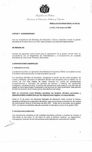 Esta resolución ministerial establece instrucciones para la organización de la gestión escolar 2001 en Bolivia. Entre otras cosas, fija el calendario escolar nacional para iniciar el 5 de febrero, establece los requisitos para la inscripción de estudiantes, norma las libretas escolares, designa directores de unidades educativas, conforma núcleos educativos, y promueve la elaboración de proyectos educativos de núcleo.