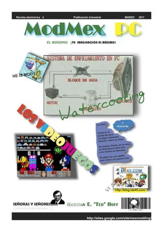 La revista electrónica ModMex, publicación trimestral desde marzo de 2011, se enfoca en modding, informática y videojuegos, destacando su crecimiento gracias al interés de los lectores. El documento incluye una breve historia de los videojuegos, mencionando hitos como 'Pong', 'Spacewar' y la invención del microprocesador por Ted Hoff, enfatizando cómo la industria ha evolucionado desde sus inicios. Además, se invita a los lectores a participar y enviar sugerencias sobre el contenido de la revista.
