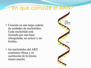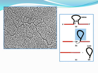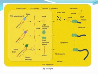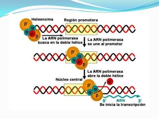 El documento describe el proceso de transcripción del ADN al ARN. Explica que la transcripción consiste en la copia de la secuencia de ADN al ARN mediante la enzima ARN polimerasa. Describe las etapas de la transcripción como la iniciación, elongación y terminación, así como los diferentes tipos de ARN polimerasa y sus funciones respectivas en la síntesis de ARN. También menciona algunos usos futuros del ARN de interferencia.