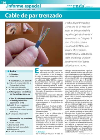 Este documento describe los diferentes tipos de cables de par trenzado utilizados en redes de seguridad, incluyendo su estructura, características e instalación. Explica que el cable de par trenzado o UTP está compuesto de pares de cobre trenzados y aislados, y es uno de los cables más utilizados. También describe otros tipos como el cable de par trenzado apantallado y sin pantalla, las diferentes categorías de UTP, y cómo conectar y montar estos cables correctamente.