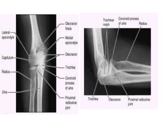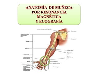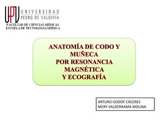 1. El documento describe la articulación del codo, sus componentes, cápsula fibrosa, ligamentos, músculos involucrados en la extensión y flexión del codo, vasos sanguíneos y nervios que lo irrigan.