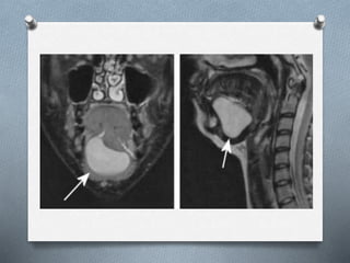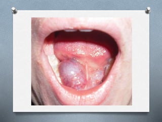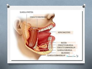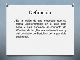 La ránula es una lesión mucocele que se forma unilateralmente en el piso de la boca, asociada al conducto de Wharton o de Bartolino. Puede ser causada por traumatismos u obstrucciones. Se presenta como una masa traslúcida, de color normal o morado-rojizo, mayor a un mucocele común. Su diagnóstico se realiza clínicamente y puede confirmarse con tomografía computarizada o resonancia magnética. Los tratamientos incluyen marsupialización, escisión de la glándula