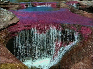 El Caño Cristales en Colombia es conocido como "el río más hermoso del mundo" debido a sus cinco colores vibrantes - amarillo, azul, verde, negro y rojo - causados por algas que cubren las rocas. Estos colores solo son visibles durante la estación húmeda de junio a noviembre. El río también contiene "marmitas de gigante", pozas circulares excavadas por la erosión del agua. Ha sido declarado Patrimonio Biológico de la Humanidad.