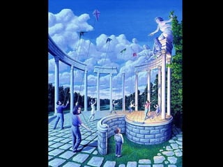 El documento resume la obra del pintor canadiense Rob Gonsalves, quien se especializa en realismo mágico e influenciado por Dalí busca combinar la realidad y la imaginación en una sola imagen. Sus trabajos representan mundos oníricos y pesadillas que parecen reales. Gonsalves pinta en un estilo surrealista que mezcla los estilos de Magritte y Escher, creando imágenes inquietantes que invitan a la contemplación repetida.