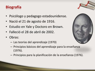 Robert Gagné fue un psicólogo y pedagogo estadounidense conocido por su Teoría del Aprendizaje. Su teoría es ecléctica e integra ideas de teóricos como Piaget, Bandura y Skinner. Propone que el aprendizaje se compone de capacidades aprendidas como destrezas motoras, información verbal e intelectuales, y actitudes. Identifica tipos de aprendizaje como condicionamiento, asociación verbal y resolución de problemas. También describe las condiciones necesarias para el aprendizaje, incl