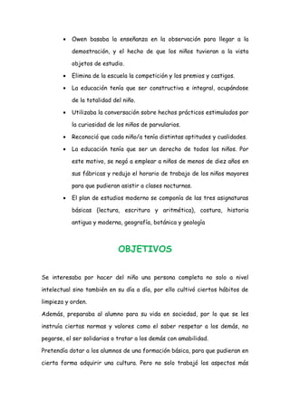 Robert Owen fue un socialista utópico escocés que estableció el primer jardín de infancia en 1816. Creía en la bondad innata de las personas y que la educación podía mejorar la sociedad. Sus principios pedagógicos incluían eliminar la competición, enfocarse en el desarrollo integral del niño y reconocer sus diferentes aptitudes. Su metodología involucraba el aprendizaje práctico a través de objetos y diálogos, así como educación nocturna para adultos.