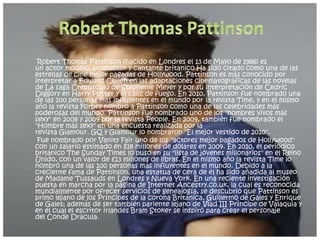 Robert Pattinson es un actor y músico británico nacido en 1986 conocido principalmente por interpretar a Edward Cullen en las películas de Crepúsculo. Comenzó su carrera como modelo a los 12 años y como actor a los 15. Su papel protagonista en Crepúsculo en 2008 lo catapultó a la fama mundial. Desde entonces ha protagonizado numerosas películas de éxito y ha recibido múltiples premios y nominaciones por su trabajo.