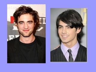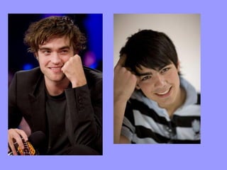 Este documento compara a Robert Pattinson y Joe Jonas, dos actores populares. La autora no está segura de quién es quién, pero a ella le gusta Joe Jonas y a su amiga le gusta Robert Pattinson. Brevemente describe sus sonrisas, apariencias y cabellos, preguntando si son sexys o no, dedicándolo a su amiga que le gusta Robert Pattinson.