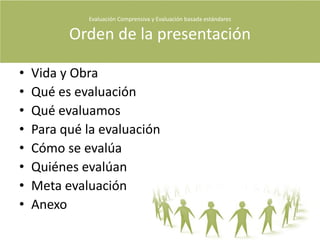 Este documento presenta una comparación entre la evaluación comprensiva y la evaluación basada en estándares realizada por Robert Stake. Explica que la evaluación comprensiva busca comprender la calidad de un programa a través de sus méritos y valor, mientras que la evaluación basada en estándares determina la calidad mediante números y escalas comparando resultados con estándares o anteriores. También describe los principales elementos de cada enfoque como objetivos, características, métodos e instrumentos.