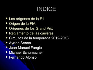 El documento resume los orígenes y hitos más importantes de la Fórmula 1. Comenzó en 1947 como respuesta al Campeonato Mundial de Motociclismo y ha evolucionado hasta convertirse en el campeonato de automovilismo más prestigioso. Entre los pilotos más exitosos se encuentran Michael Schumacher, Juan Manuel Fangio y Ayrton Senna.
