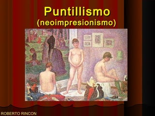 El puntillismo (neoimpresionismo) fue un movimiento pictórico que surgió a finales del siglo XIX basado en la aplicación de puntos de color puro en lugar de pinceladas. Se enfocaba en controlar las propiedades físicas del color y el espacio. Sus principales exponentes fueron Georges Seurat, Paul Signac y Charles Angrand, quienes creaban imágenes geométricas y estáticas a través de la yuxtaposición de puntos de color.