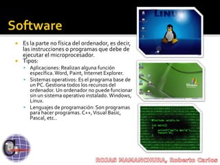El documento habla sobre el software, que son las instrucciones o programas que ejecuta el microprocesador. Explica que existen diferentes tipos de software como aplicaciones, sistemas operativos y lenguajes de programación. También menciona algunas herramientas útiles para comunicarse y compartir información como Blogger, Facebook, YouTube y SlideShare.