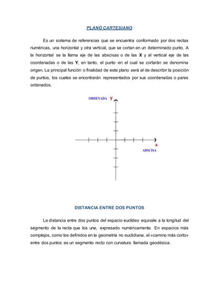 El documento describe conceptos básicos de geometría analítica como el plano cartesiano, la distancia entre puntos, el punto medio de un segmento, ecuaciones de rectas, rectas paralelas y perpendiculares, y conicas como la circunferencia, parábola, elipse e hipérbola. Explica que el plano cartesiano está formado por dos ejes perpendiculares y el origen, y que las coordenadas describen la posición de puntos. También define la distancia entre puntos y cómo calcular las coordenadas del