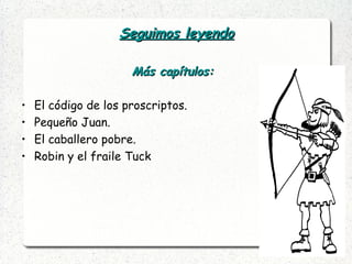 El documento presenta un análisis de la novela 'Robin Hood', dividiéndola en varios capítulos y proporcionando una descripción del personaje principal como un héroe que roba a los ricos para ayudar a los pobres. Además, se menciona una serie de actividades relacionadas, como la lectura de la novela, la visualización de una película y la recreación de escenas y personajes. También incluye una galería de personajes y un contexto medieval.