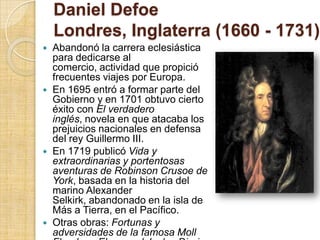 El documento resume la novela Robinson Crusoe de Daniel Defoe. Se describe que Defoe publicó la novela en 1719 basada en las historias reales de marineros abandonados en islas desiertas. La novela narra las aventuras de Robinson Crusoe mientras está varado solo en una isla durante 28 años, donde debe sobrevivir, construir refugios y volver a conectarse con otros seres humanos. El documento también analiza los temas y valores presentados en la novela como el puritanismo, la predestinación y la inteligencia humana.