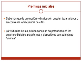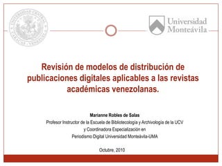 El documento revisa modelos de distribución de publicaciones digitales para revistas académicas venezolanas, destacando la importancia de la visibilidad en entornos digitales y la integración de distribución y promoción. Se enfatiza la necesidad de adoptar estrategias modernas para acceder y promover publicaciones, incluyendo el acceso abierto y el uso de redes sociales. Se concluye que es crítico que las bibliotecas y profesionales se adapten a los cambios en la producción y distribución del conocimiento.