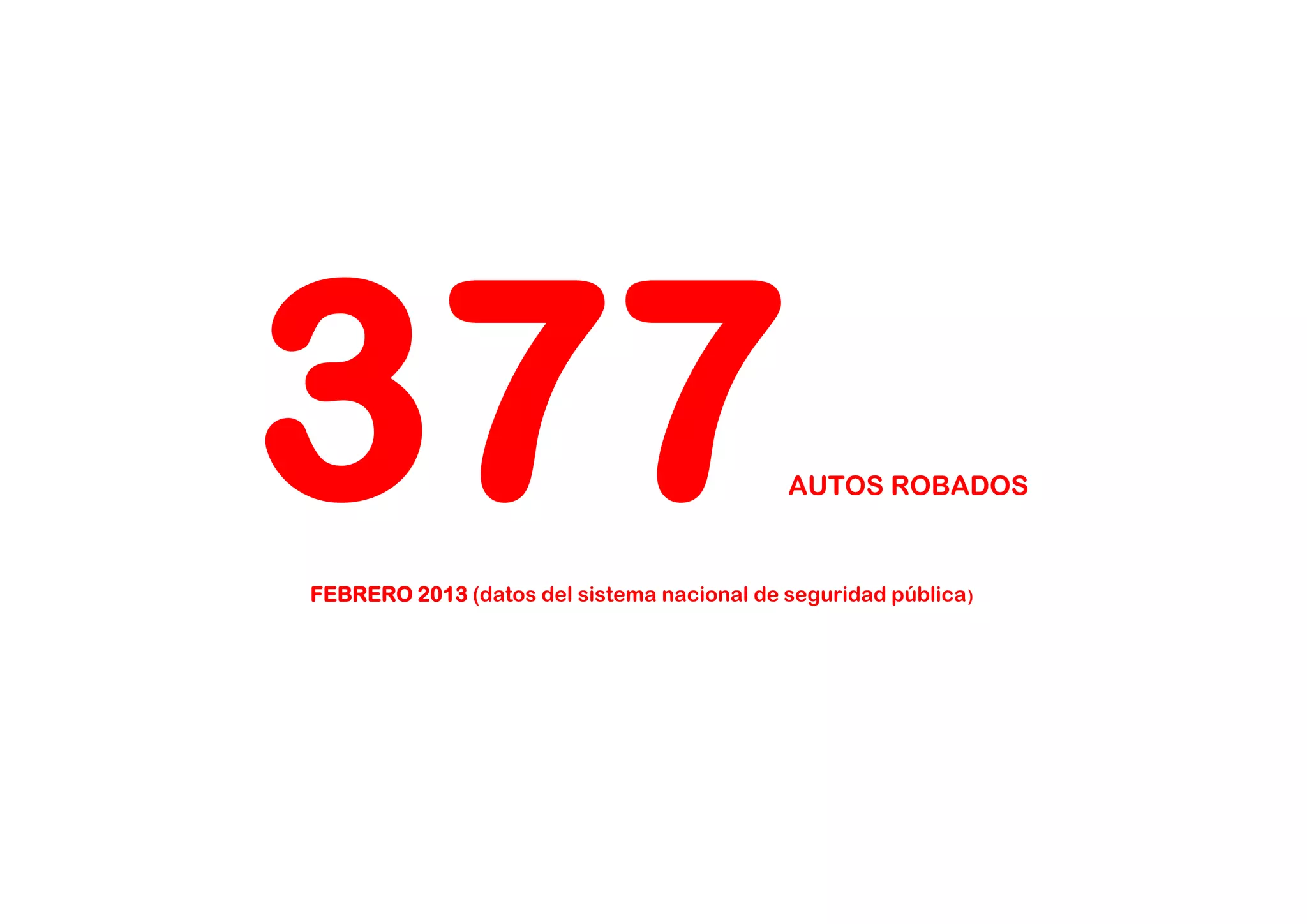 El documento presenta datos sobre el número de autos robados en México de 2003 a 2013. En febrero de 2013 se reportaron 377 autos robados, una disminución con respecto al mismo mes del año anterior. La tasa de robos de autos en Nuevo León ha ido en aumento desde 2003, aunque ha disminuido en los últimos dos años.