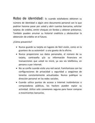El documento describe varios tipos de robos comunes en Internet, incluyendo fraude bancario a través de cajeros automáticos, robo de identidad, phishing, vishing y fraude en comercios minoristas. También resume algunos de los robos cibernéticos más grandes, como el robo de datos de 1,200 millones de usuarios por parte de hackers rusos y el robo de $420 millones del banco japonés Sumitomo Mitsui. Ofrece consejos para prevenir estos delitos, como proteger la información personal, usar conex