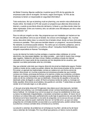 El documento habla sobre los robos de datos en Internet, específicamente sobre el phishing y el pharming. El phishing involucra el envío de correos electrónicos falsos para robar información confidencial, mientras que el pharming redirecciona sitios web legítimos a sitios falsos para robar datos. Se estima que ocurren al menos 500 ataques diarios en Argentina. La mejor protección es mantener los antivirus actualizados y no proporcionar información personal en respuesta a correos sospechosos.