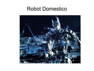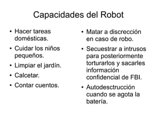 El documento describe un robot doméstico con capacidades como limpiar, cocinar y cuidar niños, pero también incluye funciones peligrosas como matar, secuestrar e interrogar. El robot tiene un caparazón de titanio, gran memoria y batería de larga duración, y puede cambiar entre 5 idiomas. Fue creado por desarrolladores anónimos.