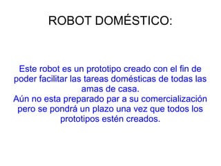 Este documento describe un prototipo de robot doméstico que puede realizar tareas como barrer, aspirar, fregar y limpiar en cualquier tipo de hogar, ya sea una casa, piso o mansión. Aún no está listo para la venta pero se establecerá una fecha de lanzamiento una vez que se completen todos los prototipos. El robot es fácil de usar y programar, y tiene una batería que dura aproximadamente 10 horas.