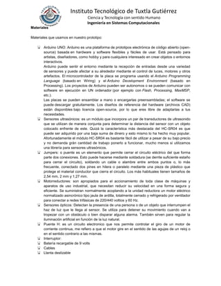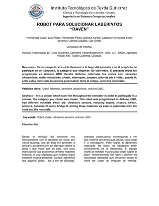 El documento describe un proyecto de un robot diseñado para resolver laberintos. El robot fue programado con Arduino UNO y equipado con sensores ultrasónicos, motores, baterías y otros componentes. El código programa al robot para detectar obstáculos con los sensores y girar en la dirección apropiada para navegar el laberinto. El proyecto proporcionó una valiosa experiencia en electrónica, programación y resolución de problemas.