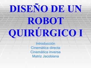 Este documento describe el diseño de un robot quirúrgico. Explica la cinemática directa e inversa del robot, incluyendo la matriz jacobiana. También cubre la dinámica directa e inversa mediante el uso de las ecuaciones de Newton-Euler. Finalmente, selecciona servomotores adecuados para cada articulación basándose en los pares máximos requeridos.