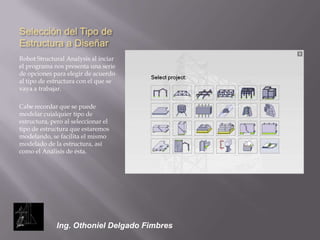 Robot StruturalAnalysis es un programa de Análisis y Diseño estructural que utiliza tecnología BIM y permite el modelado intuitivo de estructuras mediante su interfaz gráfica. El programa presenta resultados gráficos y tabulados y permite analizar diferentes tipos de estructuras como marcos, losas, porticos y modelos volumétricos.