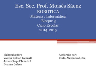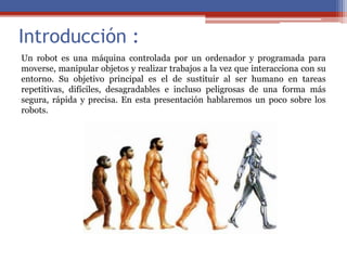 Este documento resume la historia y el desarrollo de la robótica. Explica que los primeros robots se crearon para imitar funciones humanas y reemplazar a los humanos en tareas repetitivas o peligrosas. También describe los primeros robots programables y las leyes de la robótica propuestas por Isaac Asimov. Finalmente, discute las ideas actuales sobre los robots autónomos y su uso en exploración espacial y aplicaciones militares y domésticas.