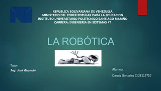 Este documento describe los diferentes tipos de robots, incluyendo androides, móviles, industriales, médicos y zoomórficos. Explica que la robótica involucra el diseño, fabricación y uso de máquinas que imitan funciones humanas o animales. También discute los impactos de la robótica en la automatización industrial, educación, competitividad, trabajo y el hogar. Concluye que la robótica ha facilitado tareas difíciles y mejorado la producción, y seguirá evolucionando en el futuro.