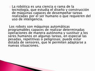 La robótica estudia el diseño y construcción de máquinas capaces de realizar tareas humanas o que requieren inteligencia. Los robots son máquinas programables que pueden realizar operaciones de manera autónoma y sustituir a humanos en tareas pesadas, repetitivas o peligrosas. Existen diferentes tipos de robots clasificados por su función y diseño.