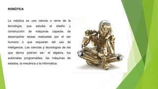 El documento trata sobre varios temas relacionados con la robótica. Describe brevemente qué es la robótica y sus aplicaciones como la asistencia a ancianos. También menciona varios avances recientes como exoesqueletos, robots humanoides y una mano robótica con tacto.