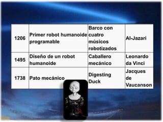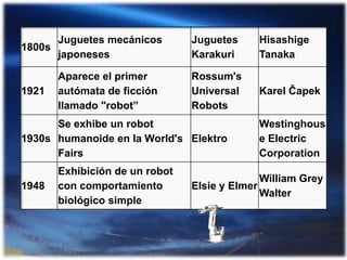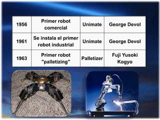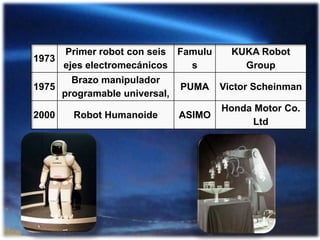 La robótica es una ciencia que estudia el diseño y construcción de máquinas inteligentes capaces de realizar tareas humanas. Los robots se han clasificado en generaciones según su cronología y en categorías como móviles, androides o zoomórficos según su arquitectura. La robótica tiene aplicaciones en industrias, medicina, investigación espacial y agricultura. Aunque los robots actuales tienen limitaciones como la falta de inteligencia plena, el futuro podría incluir robots autónomos con atributos superiores a los humanos.