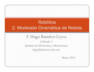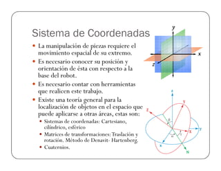 Este documento trata sobre el modelado cinemático de robots. Explica los sistemas de coordenadas cartesianas, cilíndricas y esféricas, así como las matrices de rotación y transformación que permiten definir la posición y orientación de un robot. También cubre temas como ángulos de Euler, coordenadas homogéneas y funciones para manipular objetos mediante rotaciones y traslaciones.
