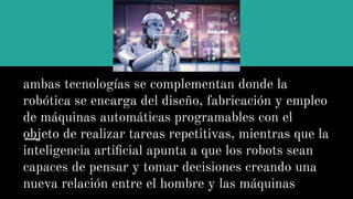 La robótica y la inteligencia artificial se complementan para diseñar máquinas automáticas que realizan tareas repetitivas y toman decisiones. Ambas tecnologías están transformando diversos sectores como la salud, la industria y la atención al cliente, proporcionando mejoras significativas y disrupciones tecnológicas. Sophia, el robot humanoide, es un ejemplo notable de cómo estas tecnologías están evolucionando y adaptándose al comportamiento humano.