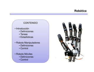 Este documento trata sobre robótica. Explica que la robótica involucra mecánica, electrónica, informática y control. Describe robots manipuladores y móviles, y cómo se usan descriptores espaciales como posición, orientación y matrices de rotación para controlar los movimientos de los robots.