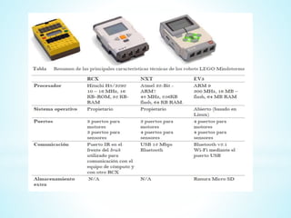 El documento describe diferentes sensores que pueden usarse con el robot Lego Mindstorms NXT, incluyendo sensores táctiles, acústicos, fotosensibles y ultrasónicos. También menciona el uso de servomotores, lámparas e interacción a través de Bluetooth.