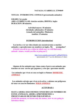Este documento presenta una lección de 80 minutos para estudiantes de 3er grado sobre la introducción de animales en inglés. La lección consiste en ver un video que muestra diferentes animales y sus nombres en inglés, distinguir entre animales domésticos y salvajes, y aprender a presentar los animales diciendo su nombre. Los estudiantes luego armarán un animal y analizarán lo aprendido.