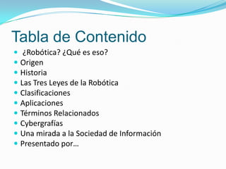 Este documento provee una introducción a la robótica, incluyendo su definición, origen e historia. También describe las Tres Leyes de la Robótica de Isaac Asimov, las clasificaciones de robots, sus aplicaciones principales y términos relacionados. Finalmente, analiza brevemente el cambio hacia una sociedad basada en el conocimiento.