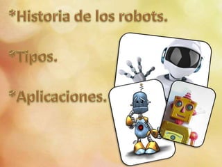 Un robot puede ser una entidad física o virtual. Existen diferentes tipos de robots, incluyendo aquellos con forma humana, de animales o con ruedas. Los robots se clasifican en cuatro formas principales - robots con forma humana, robots móviles con ruedas, robots que imitan animales, y robots con pocos grados de libertad en las extremidades.